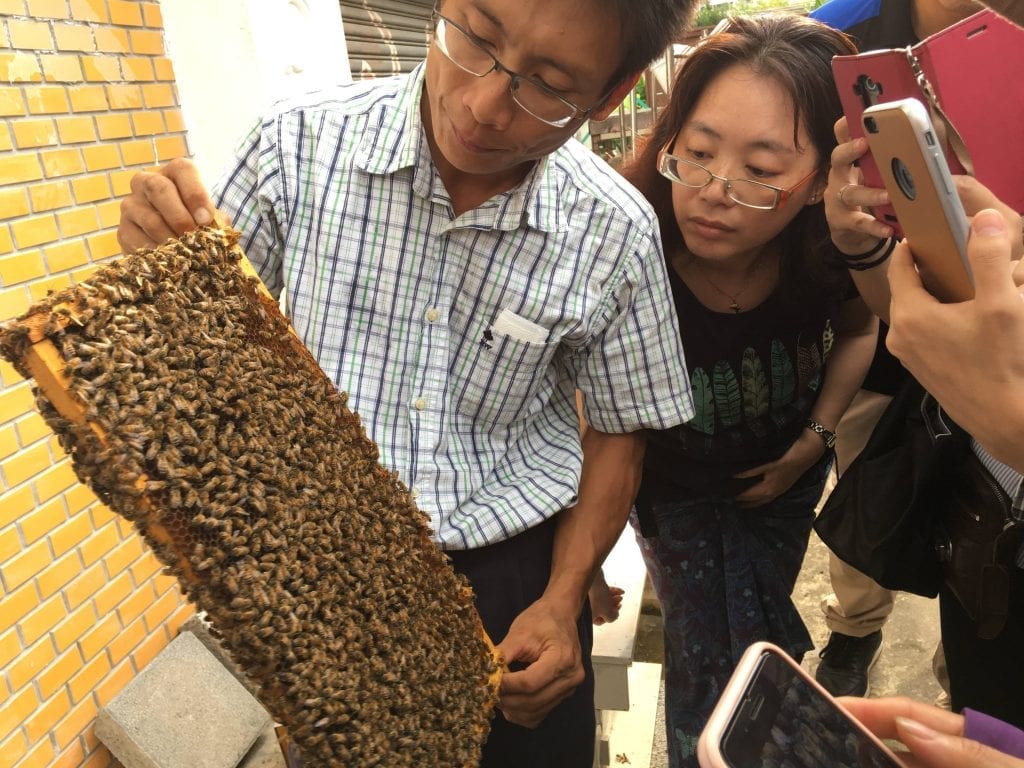 3月10日下午二時,蔡明憲老師【追花逐蜜-養好蜂、吃好蜜、顧環境】課程,介紹蜜蜂生物特性、蜂類的多樣性以及在農業上的運用,現場並搭配蜂箱進行說明。